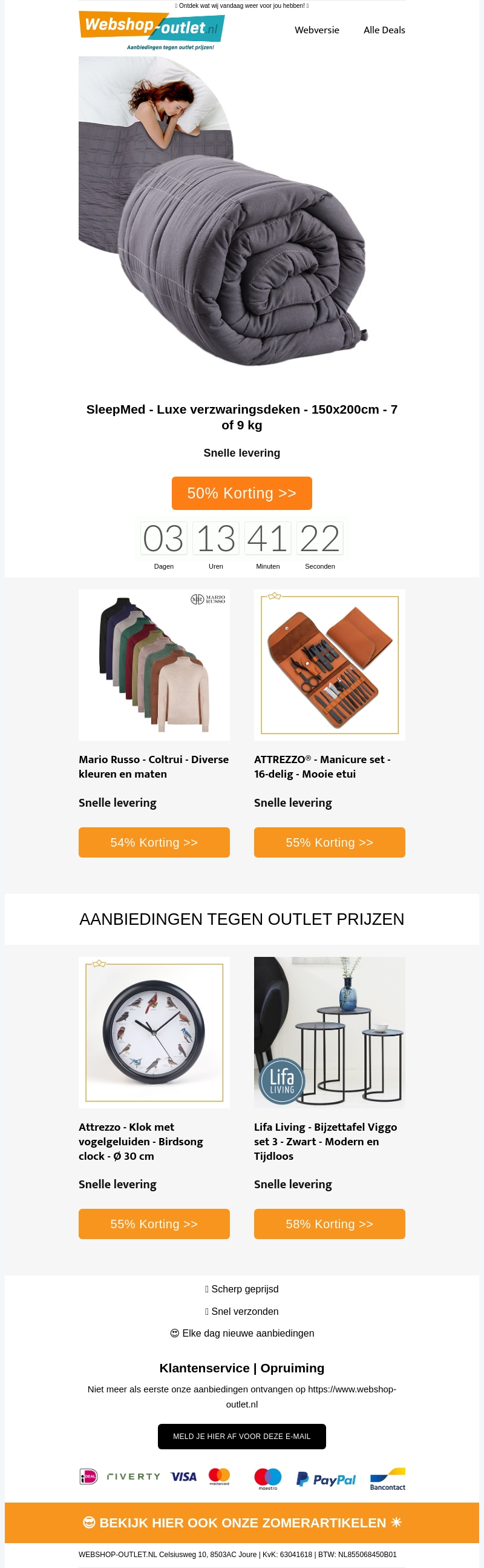 Deze nieuwsbrief bevat geweldige aanbiedingen zoals de luxe verzwaringsdeken van SleepMed, stijlvolle coltruien van Mario Russo, een complete manicureset van ATTREZZO, de rustgevende vogelsong klok en moderne bijzettafels van Lifa Living. Ontvang hoge kortingen tot wel 58%. Profiteer nu!
