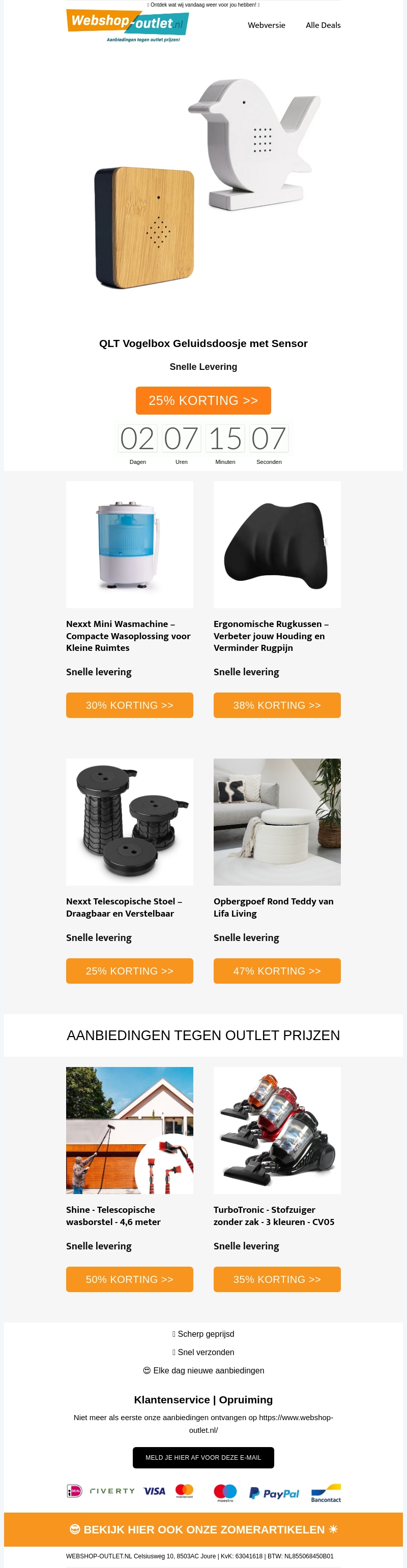 Mis deze exclusieve aanbiedingen niet! Krijg 25% korting op de QLT Vogelbox met sensor, 30% op de compacte Nexxt mini wasmachine en 38% op ergonomische rugkussens. Profiteer nu van snelle levering en hoge kortingen op diverse producten, zoals de Telescopische Stoel, Opbergpoef Teddy, en de TurboTronic stofzuiger.