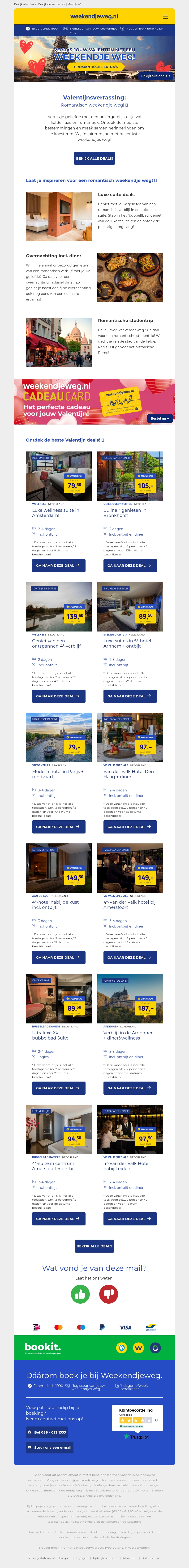 Verwen je geliefde met speciale Valentijnsdag aanbiedingen en inspirerende tips. Ontdek romantische weekendjes weg en cadeaus die magische herinneringen creëren. Laat je inspireren door onze zorgvuldig samengestelde deals voor een onvergetelijke Valentijnsdag.