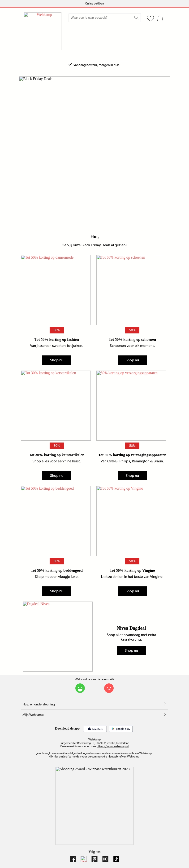 Vier Black Friday met spectaculaire kortingen bij Wehkamp! Profiteer tot 50% korting op damesmode, schoenen, kerstartikelen, en meer. Shop de nieuwste stijlen en trends en geniet van enorme besparingen op topmerken. Ontdek ook speciale aanbiedingen op verzorgingsapparaten en Vingino. Bezoek Wehkamp vandaag nog en shop nu.