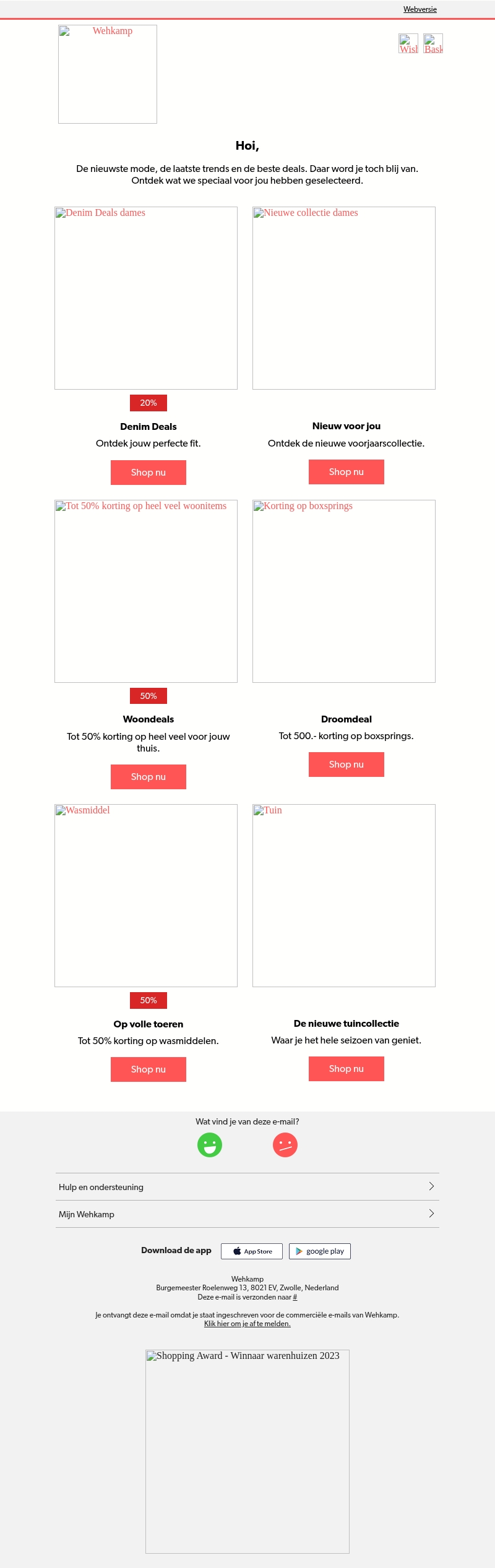 Welkom bij de nieuwste aanbiedingen van Wehkamp! Ontdek de nieuwste mode en woontrends met kortingen tot wel 50%. Profiteer van de aantrekkelijke Denim Deals en de voorjaarscollectie. Bovendien zijn er geweldige kortingen op woonitems en boxsprings. Ontdek meer en shop nu!