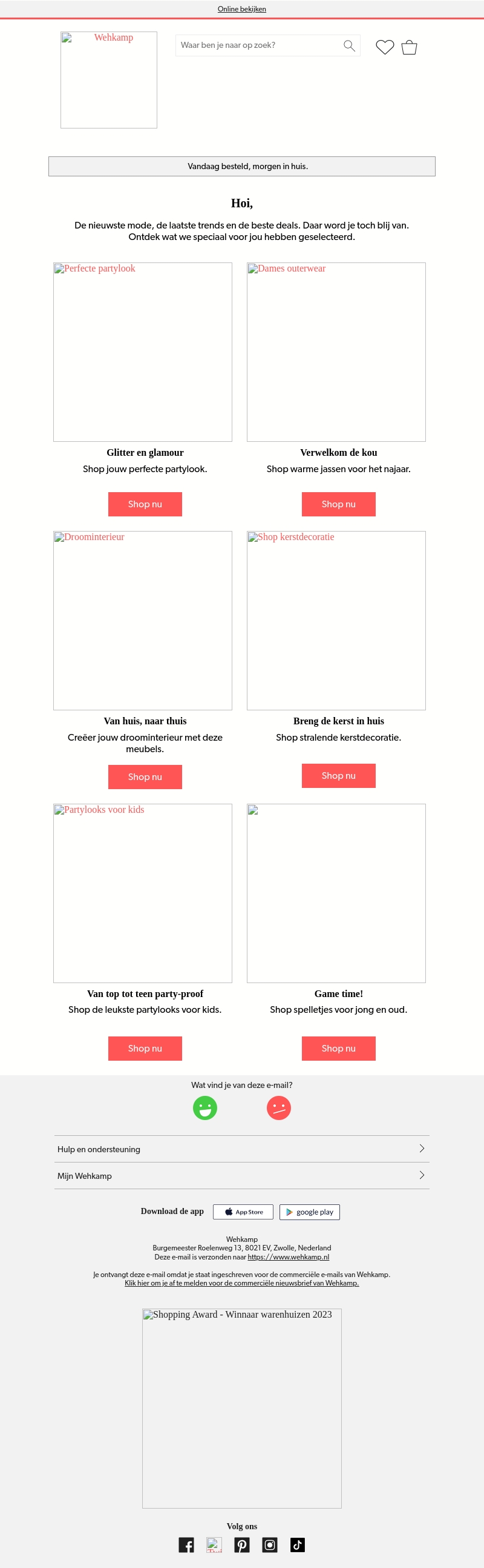 Vind de perfecte partylook bij Wehkamp, inclusief glitterende outfits en warme winterjassen. Creëer een droominterieur voor de feestdagen en verwelkom de kou in stijl. Vergeet ook niet de leukste outfits voor kinderen en stralende kerstdecoratie.