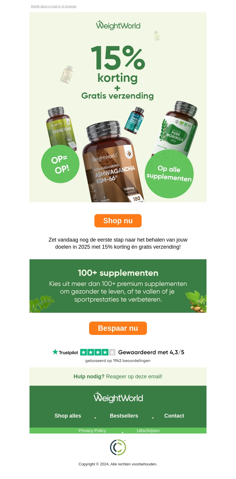 WeightWorld biedt nu 15% korting op alle supplementen, inclusief gratis verzending. Kies uit meer dan 100 premium producten die bijdragen aan een gezonder leven. Vertrouwd door vele klanten, ontvang je extra voordeel bij je aankopen. Mis de kans niet om te besparen en je gezondheidsdoelen voor 2025 te bereiken. Bestel vandaag nog!
