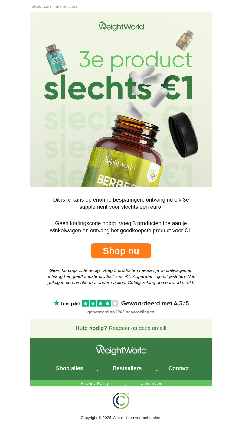 Mis deze kans bij WeightWorld niet! Voeg drie producten toe aan je winkelwagen en ontvang het goedkoopste product voor slechts €1. Deze aanbieding is perfect voor wie effectief wil besparen. De actie is eenvoudig: geen kortingscode nodig, alleen jouw winkelplezier! Geldig zolang de voorraad strekt, dus wacht niet te lang.