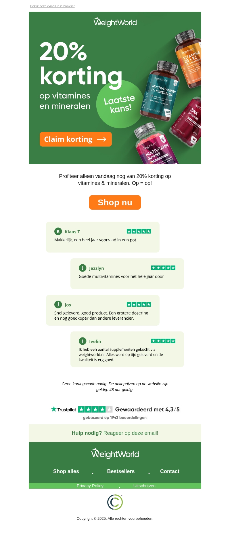Profiteer vandaag nog van 20% korting op alle vitamines en mineralen bij WeightWorld. Geen kortingscode nodig, de korting wordt automatisch verrekend. Beperkte voorraad, dus op = op! Bekijk de uitstekende klantbeoordelingen en bestel direct.