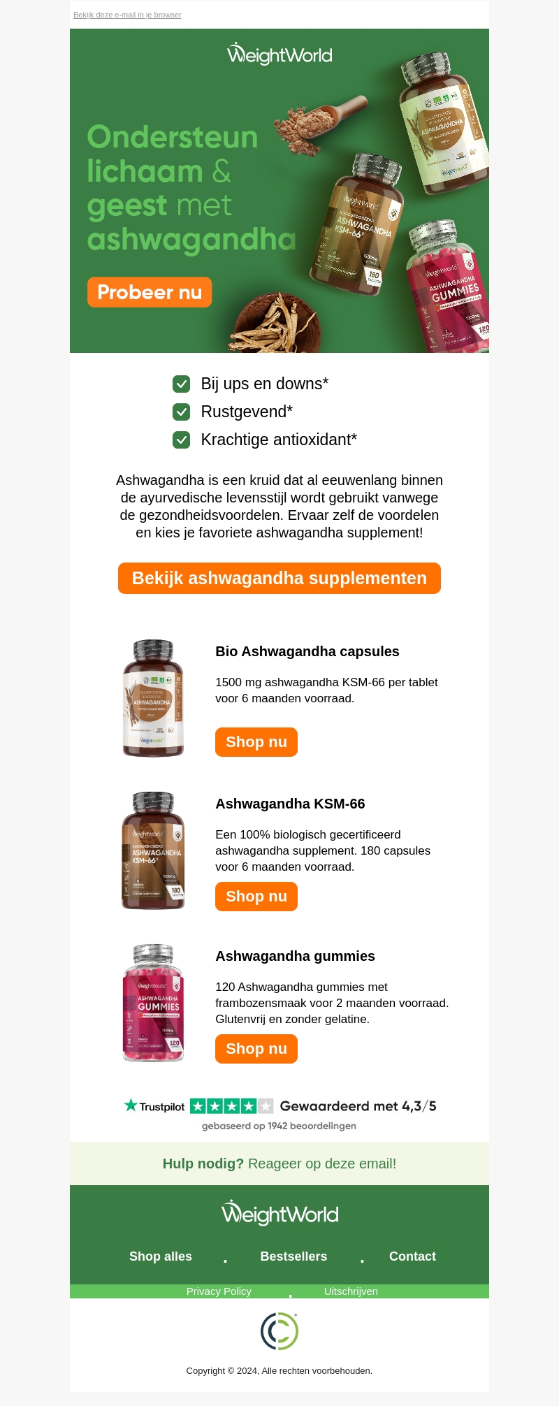 Ontdek de voordelen van Ashwagandha, een krachtig kruid dat rustgevend werkt en als antioxidant fungeert. Geworteld in de ayurvedische levensstijl, biedt Ashwagandha ondersteuning bij ups en downs. Kies je favoriete supplement en ervaar zelf de gezondheidsvoordelen.