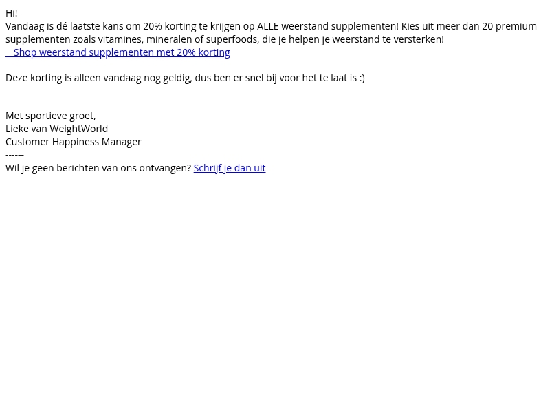 Vandaag is dé laatste kans om 20% korting te krijgen op alle weerstand supplementen bij WeightWorld. Kies uit meer dan 20 premium supplementen zoals vitaminen, mineralen en superfoods, die je helpen je weerstand te versterken. Deze korting is alleen vandaag geldig, dus ben er snel bij!