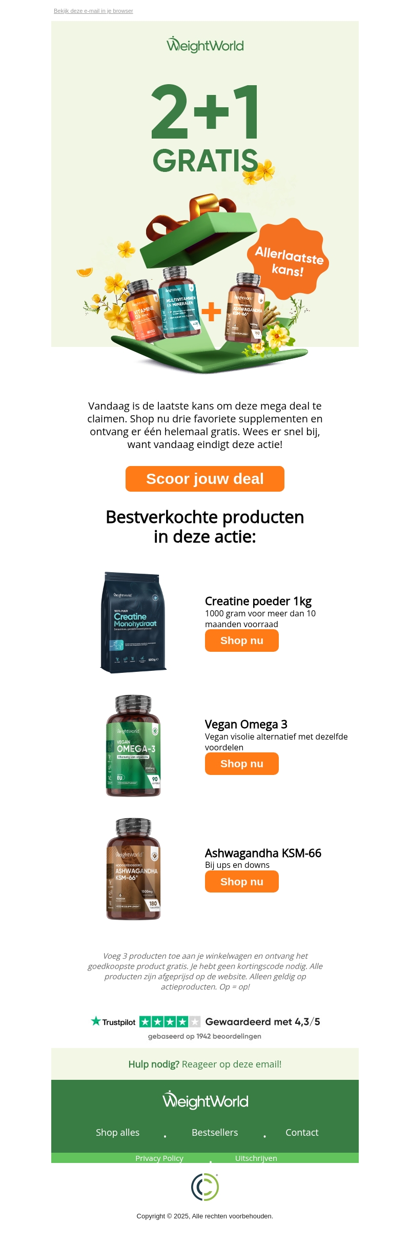Vandaag is de laatste kans om te profiteren van de 2+1 gratis aanbieding op top supplementen bij WeightWorld. Voeg drie producten toe aan je winkelwagen en ontvang het goedkoopste product gratis. Deze actie is geldig op specifieke producten en alleen voor vandaag. Mis het niet en scoor je deal nu! Geen kortingscode nodig, alles is al afgeprijsd op de website.