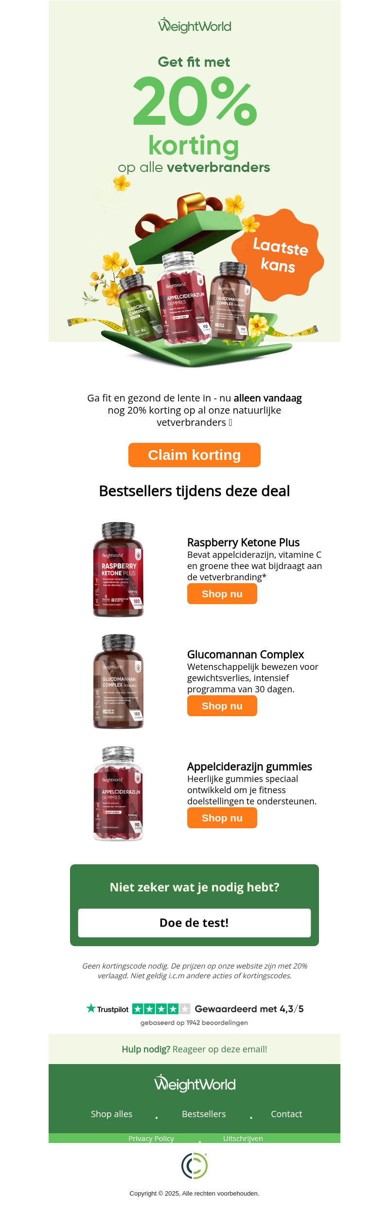 Ga fit de lente in met een exclusieve 20% korting op alle vetverbranders bij WeightWorld. Ontdek onze bestsellers zoals Raspberry Ketone Plus en Appelciderazijn gummies. Profiteer van natuurlijke producten die je helpen je fitnessdoelen te bereiken. Mis deze kans niet, de aanbieding geldt alleen vandaag. Claim nu je korting en start je fitnessreis.