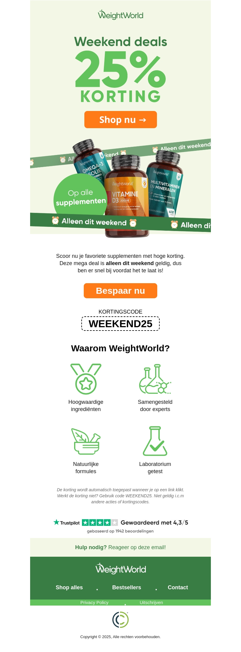 Profiteer dit weekend van een exclusieve 25% korting op alle WeightWorld supplementen. Deze aanbieding geldt alleen dit weekend, dus wees er snel bij. WeightWorld biedt hoogwaardige en natuurlijke supplementen samengesteld door experts. Vergroot je gezondheid met hun laboratoriumgeteste formules. Ontvang de korting automatisch of gebruik de code WEEKEND25.