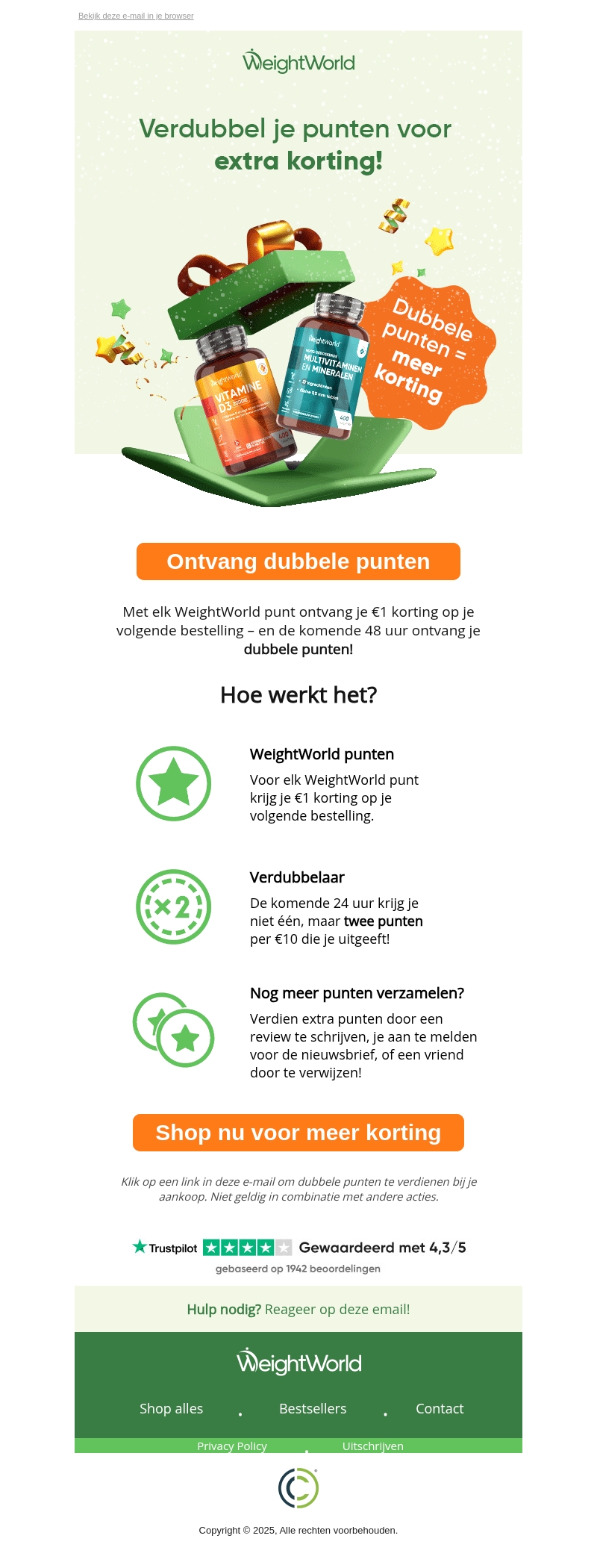 Met WeightWorld krijg je nu dubbele punten bij je aankopen, wat direct resulteert in extra korting voor je volgende bestellingen. Per uitgegeven €10 verdien je twee punten. Ontdek ook mogelijkheden om extra punten te verdienen door reviews te schrijven en vrienden uit te nodigen. Geniet van deze voordelen maar liefst 48 uur lang!