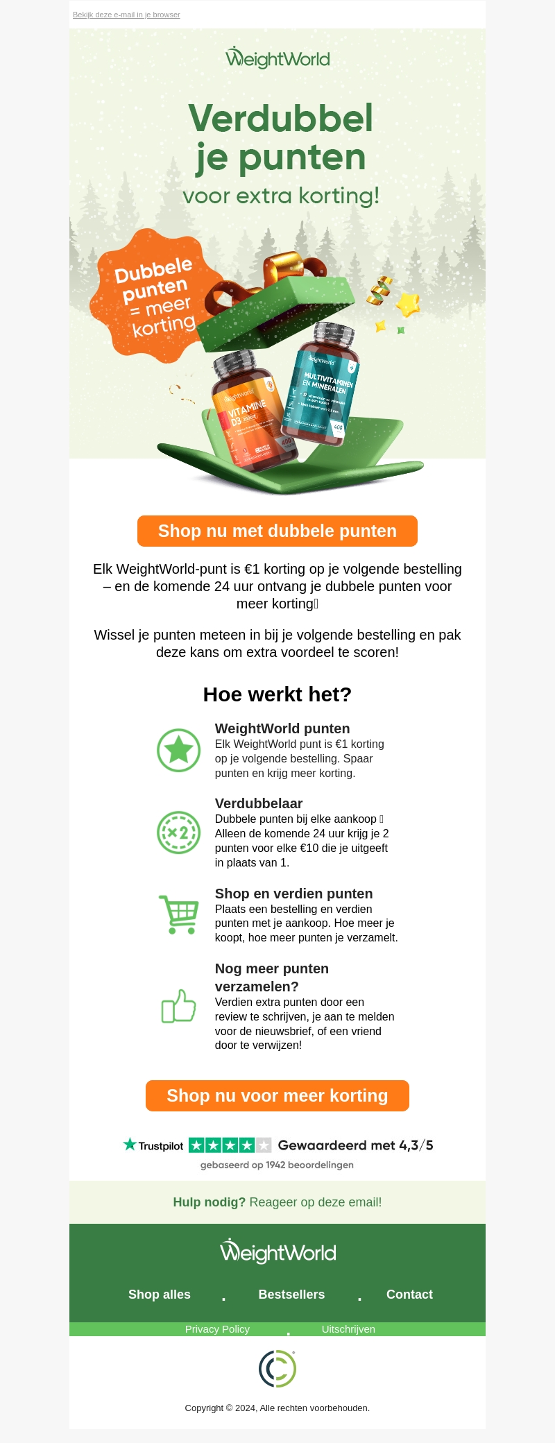 Bij WeightWorld krijg je nu dubbele punten bij elke aankoop, wat betekent dat je nog meer korting krijgt op je volgende bestelling. Elk punt vertegenwoordigt €1 korting, en alleen de komende 24 uur kun je profiteren van deze dubbele puntenactie. Spaar voor nog meer voordeel door aankopen te doen, reviews te schrijven, of vrienden door te verwijzen. Shop nu en ontdek hoeveel je kunt besparen!