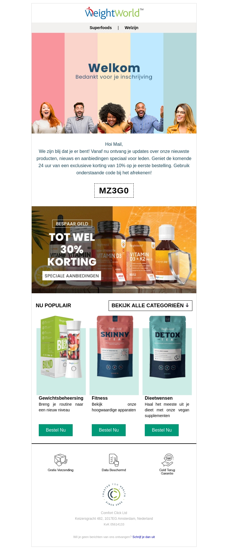 Welkom bij WeightWorld! Wij zijn blij dat je je hebt ingeschreven. Ontvang updates over onze nieuwste producten, nieuws en aanbiedingen speciaal voor leden. Gebruik de code MZ3G0 om 10% korting te ontvangen op je eerste bestelling binnen 24 uur. Bespaar ook tot 30% op vitamineproducten.