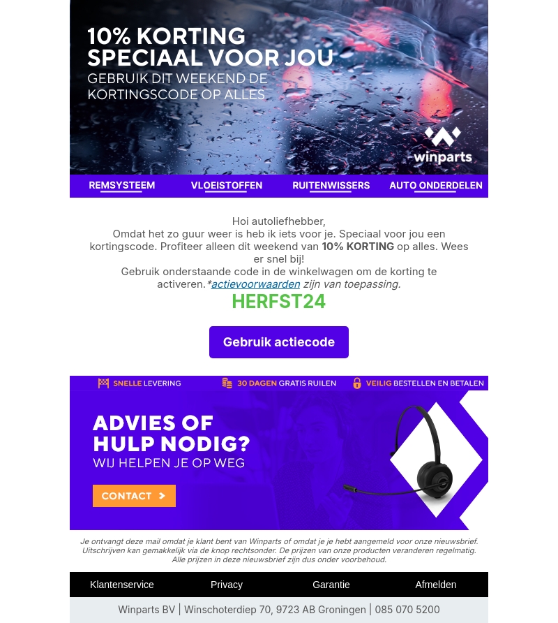 Hoi autoliefhebber, het is weer tijd voor een speciale aanbieding van Winparts. Alleen dit weekend krijg je 10% korting op alles in onze winkel. Gebruik de kortingscode HERFST24 bij het afrekenen om de korting te activeren. Mis deze kans niet en bespaar op hoogwaardige auto-onderdelen.