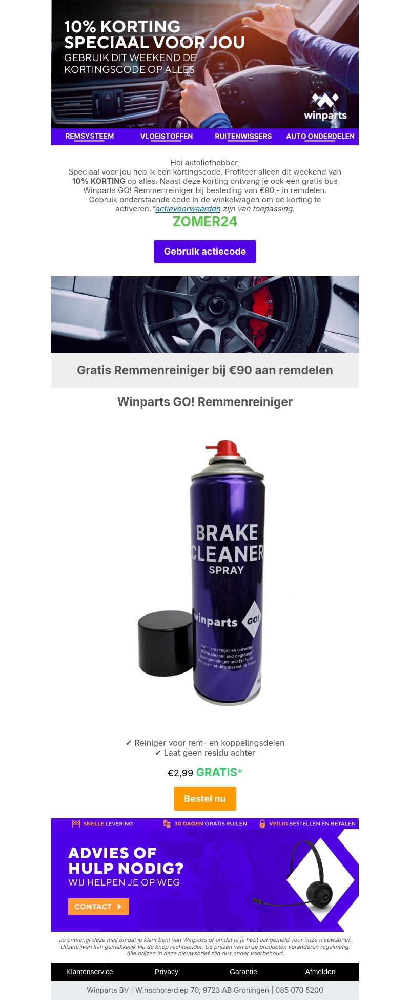 Profiteer dit weekend van 10% korting op alles door de kortingscode ZOMER24 te gebruiken. Ontvang daarnaast een gratis Winparts GO! Remmenreiniger bij besteding van €90,-. Mis deze kans niet en geniet van geweldige aanbiedingen voor jouw auto.