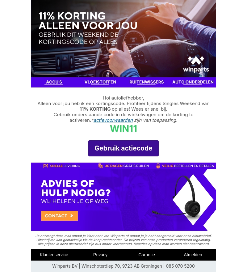 Winparts biedt een exclusieve korting van 11% speciaal voor jou tijdens het Singles Weekend. Ontvang korting op al je aankopen met de code WIN11. Mis deze kans niet om te besparen op je auto-onderdelen. Geldig voor een beperkt tijd, dus sla snel je slag.