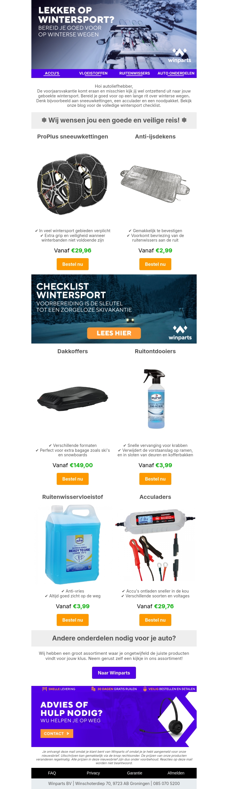 Bereid je goed voor op je wintersportvakantie met essentiële auto-onderdelen zoals sneeuwkettingen, anti-ijsdekens, en acculaders. Ontdek ons assortiment voor een zorgeloze reis. Bekijk onze checklist voor een complete voorbereiding en profiteer van scherpe prijzen.