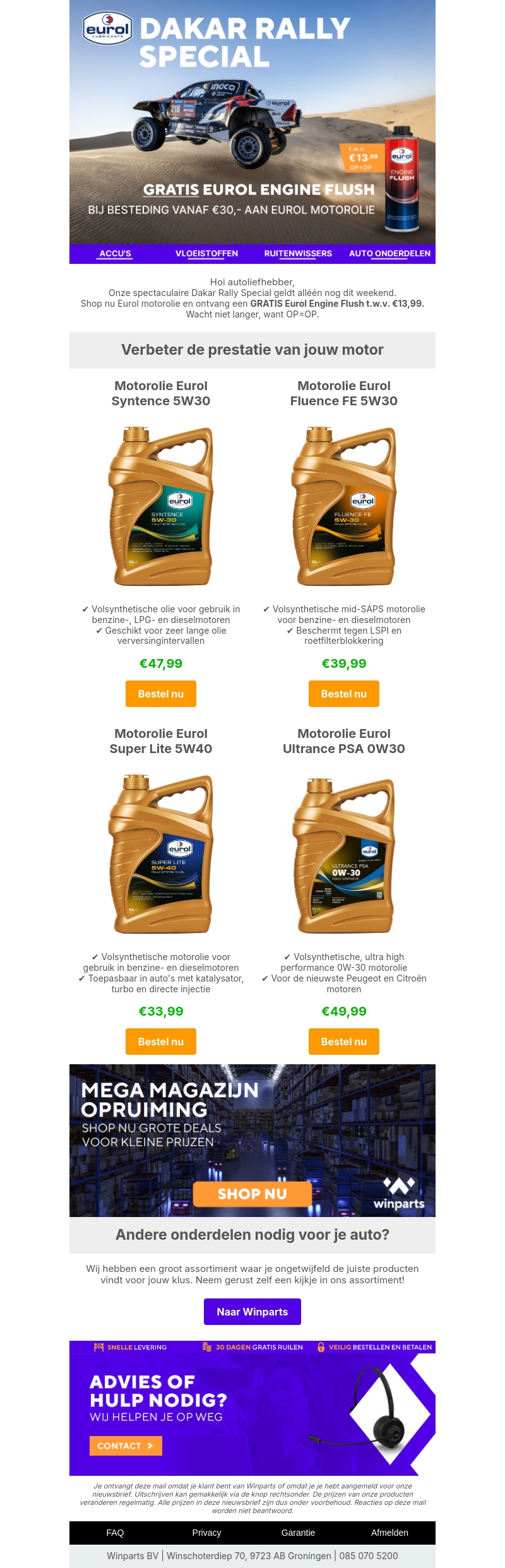 Ben je klaar voor de Dakar Rally Special? Ontvang een gratis Eurol Engine Flush ter waarde van €13,99 bij een besteding vanaf €30 aan Eurol motorolie. Haast je, deze actie is alleen geldig dit weekend! Bekijk onze selectie van hoogwaardige motoroliën en verbeter de prestaties van je voertuig. Profiteer nu van deze exclusieve aanbieding.