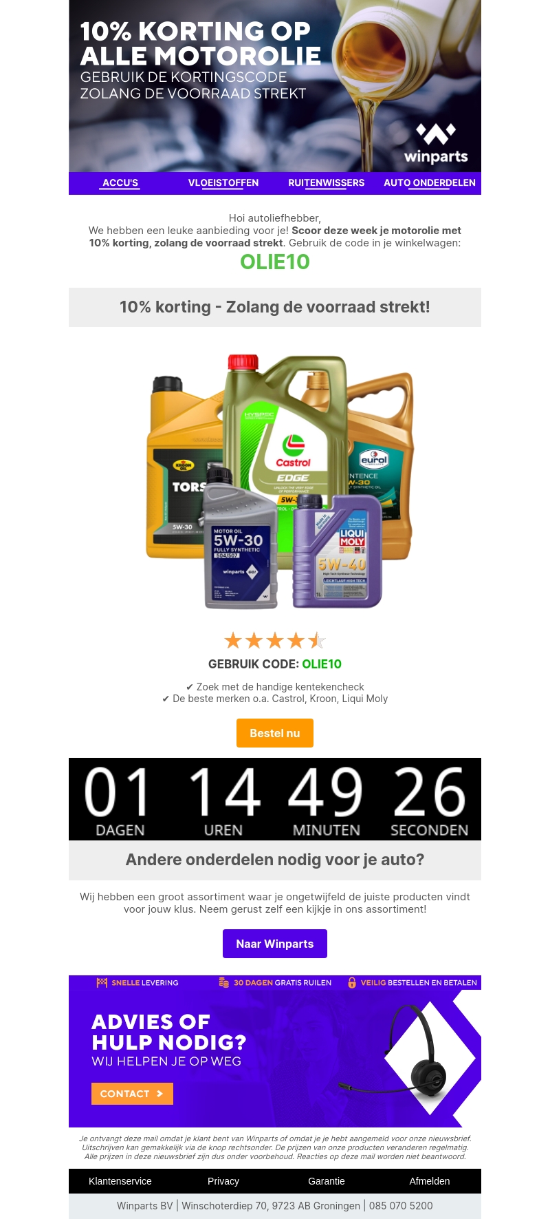 Hoi autoliefhebber, deze week krijg je 10% korting op motorolie bij Winparts! Gebruik de kortingscode OLIE10 bij het afrekenen. Wees er snel bij, want dit aanbod geldt alleen zolang de voorraad strekt.