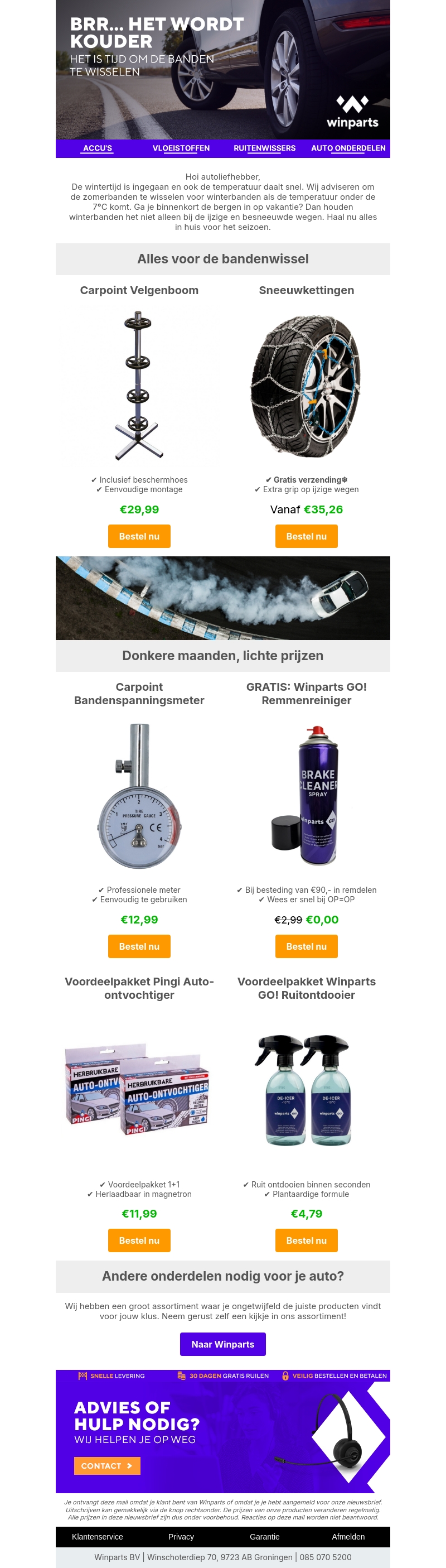 De winter is in aantocht en het is tijd om je auto voor te bereiden! Wissel je zomerbanden om voor winterbanden en bekijk de beste deals bij Winparts. Profiteer van aanbiedingen op velgenbomen, sneeuwkettingen, en meer. Zorg ervoor dat je auto klaar is voor de koude maanden met ons uitgebreide assortiment.