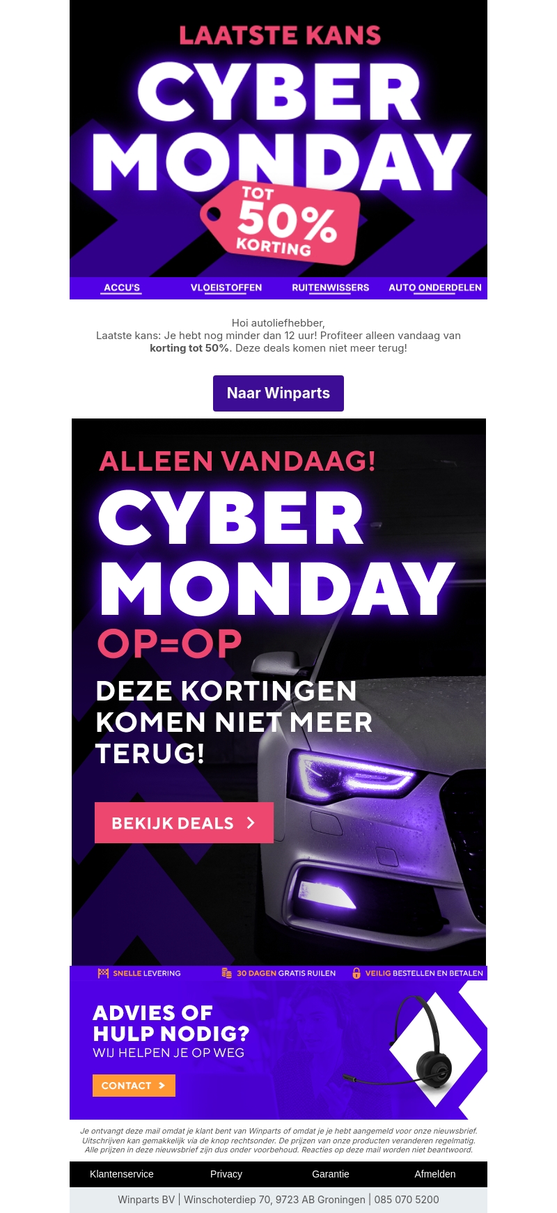 Mis deze geweldige kans niet! Cyber Monday biedt je kortingen tot 50% op diverse producten zoals accu's, vloeistoffen, ruitenwissers en meer. Alleen vandaag geldig en OP=OP. Profiteer nu van deze unieke aanbiedingen bij Winparts.