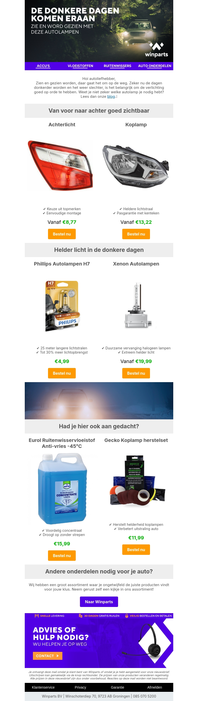 Bereid je voor op de donkere dagen met topkwaliteit autolampen van Winparts. Kies uit een breed assortiment van achterlichten, koplampen en meer, allemaal voor scherpe prijzen. Verbeter uw nachtzicht en rij veiligheid met ons uitgebreide aanbod. Bekijk ook onze andere handige auto-onderdelen en vloeistoffen. Vergeet niet ons blog te lezen voor meer tips en advies.