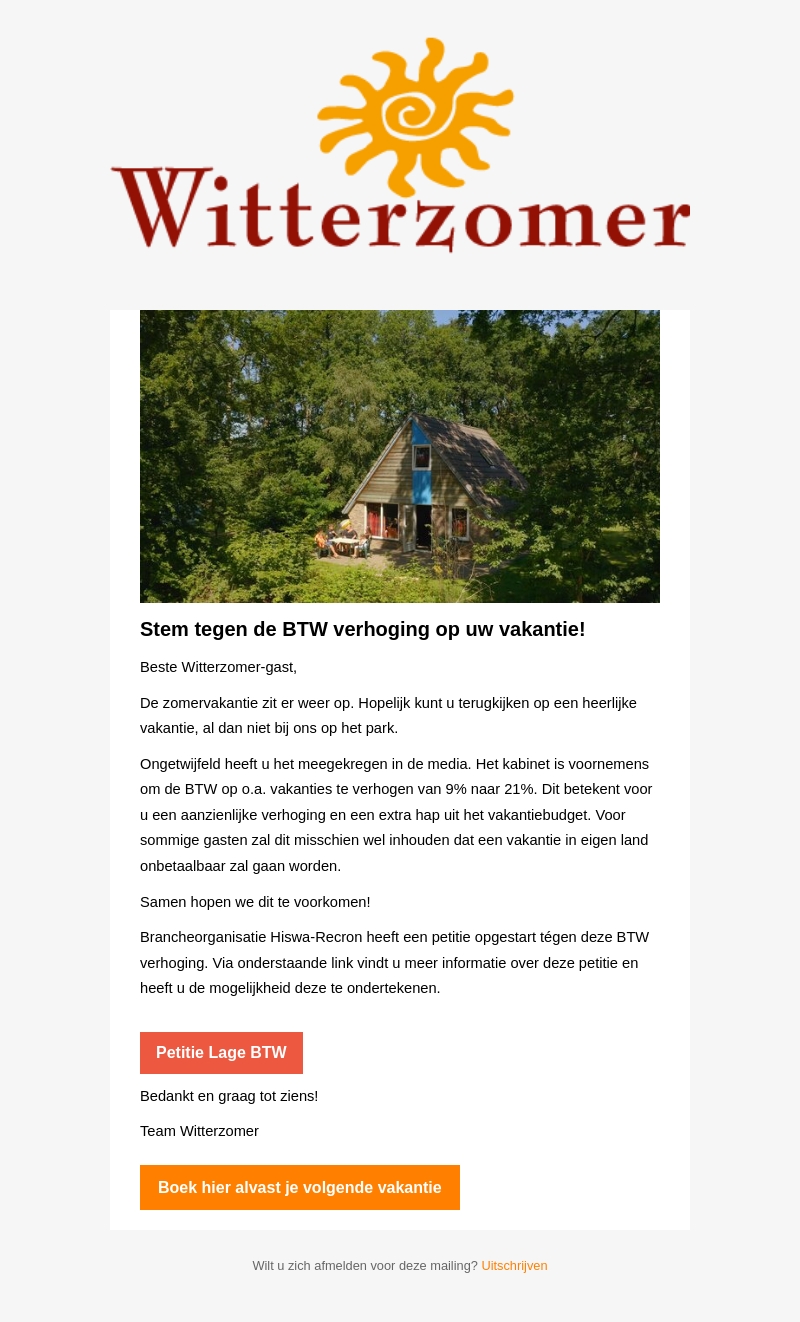 De zomer is voorbij en Witterzomer bedankt alle gasten voor hun bezoek. Er is echter sprake van een voorgenomen btw-verhoging van 9% naar 21% op vakanties. Deze verandering kan vakanties duurder en minder toegankelijk maken. Brancheorganisatie Hiswa-Recron heeft een petitie opgestart om deze verhoging tegen te gaan. Lees verder voor meer informatie en om de petitie te ondertekenen.