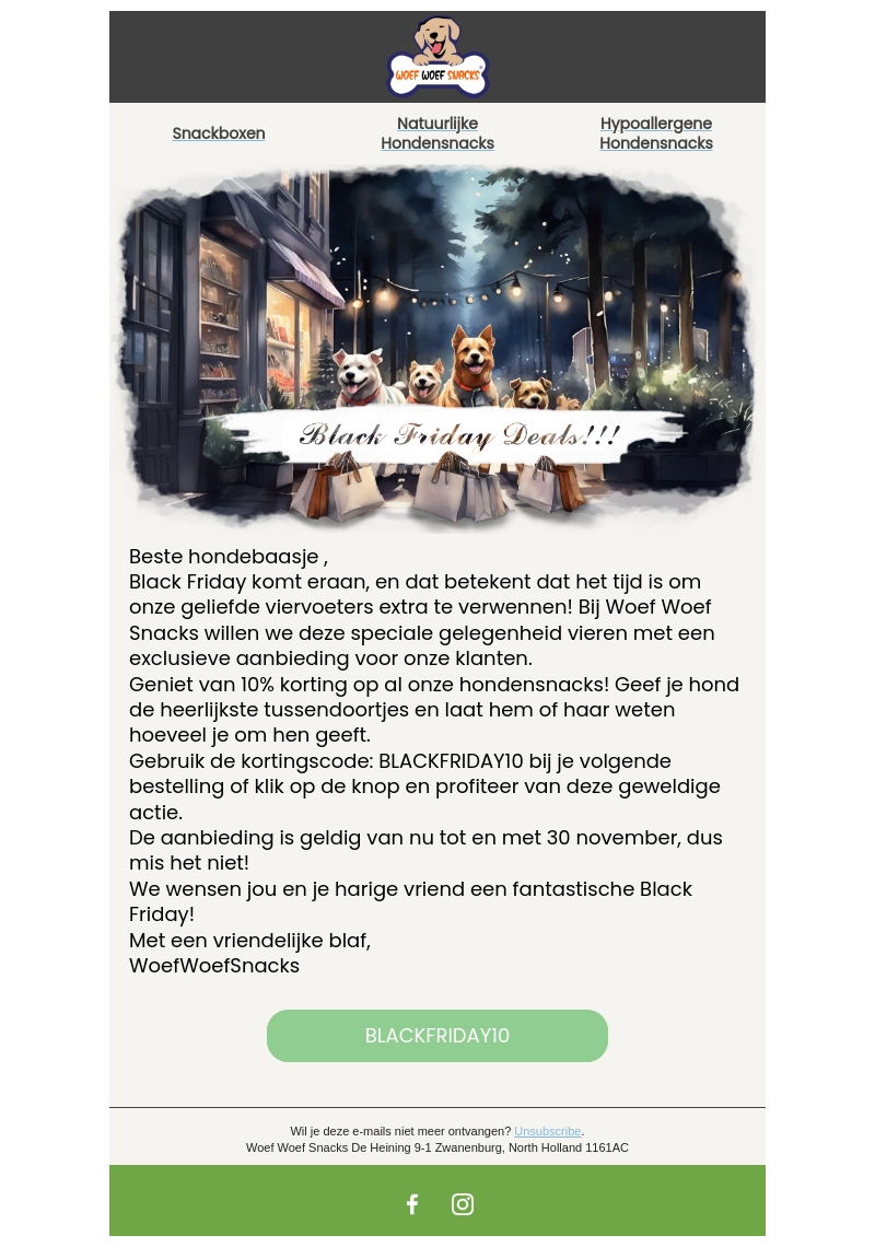 Black Friday is de perfecte gelegenheid om je trouwe viervoeter te verwennen met ons uitgebreide aanbod van heerlijke hondensnacks. Profiteer nu van 10% korting op ons volledige assortiment, en maak gebruik van de kortingscode BLACKFRIDAY10 om de beste deals te scoren. Wees er snel bij, want deze aanbieding is geldig tot en met 30 november. Mis de kans niet om je hond te verrassen met smakelijke snacks!