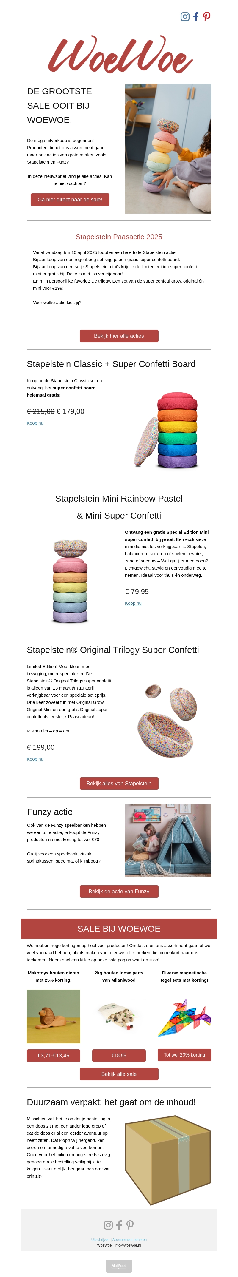 Duik in de grootste sale ooit bij WoeWoe met kortingen op topmerken zoals Stapelstein en Funzy. Geniet van unieke aanbiedingen, zoals gratis boards bij aankoop van Stapelstein producten. Deze Pasen zijn er speciale deals die u niet wilt missen! Verken de aantrekkelijke prijzen en geniet van duurzame verpakkingen die bij elke bestelling worden aangeboden.