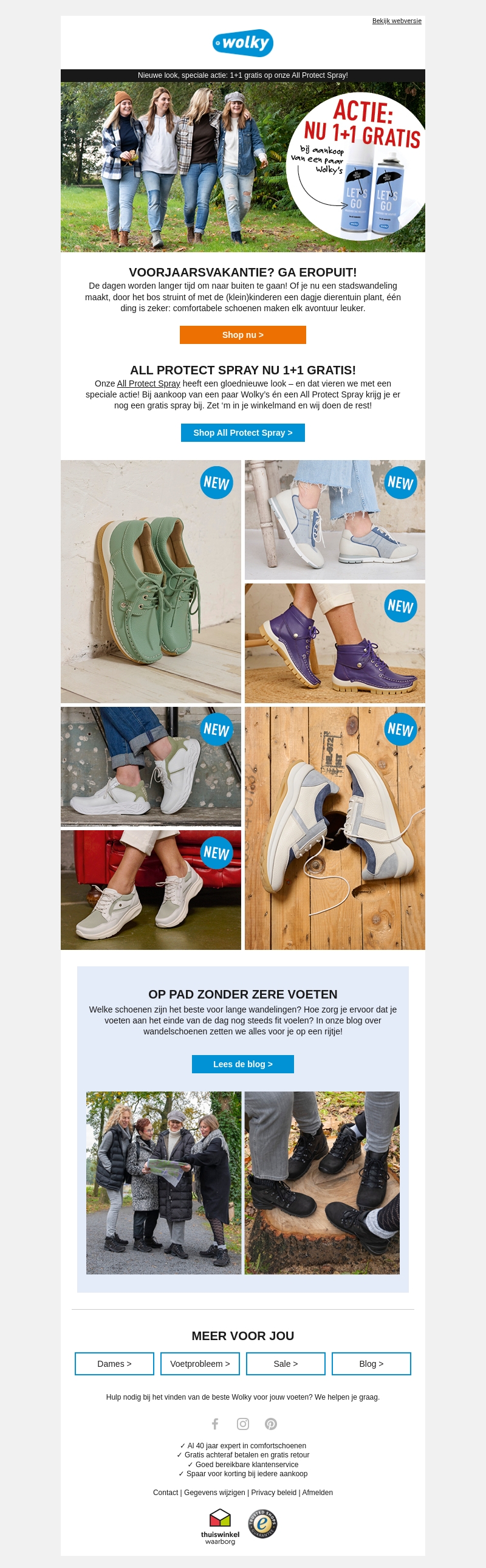 De voorjaarsvakantie is de ideale tijd om eropuit te gaan met comfortabele Wolky schoenen. Of je nu een stadswandeling maakt of het bos intrekt, met Wolky zit je altijd goed. Profiteer nu van de speciale 1+1 gratis actie op onze All Protect Spray en bescherm je schoenen tijdens al je avonturen.