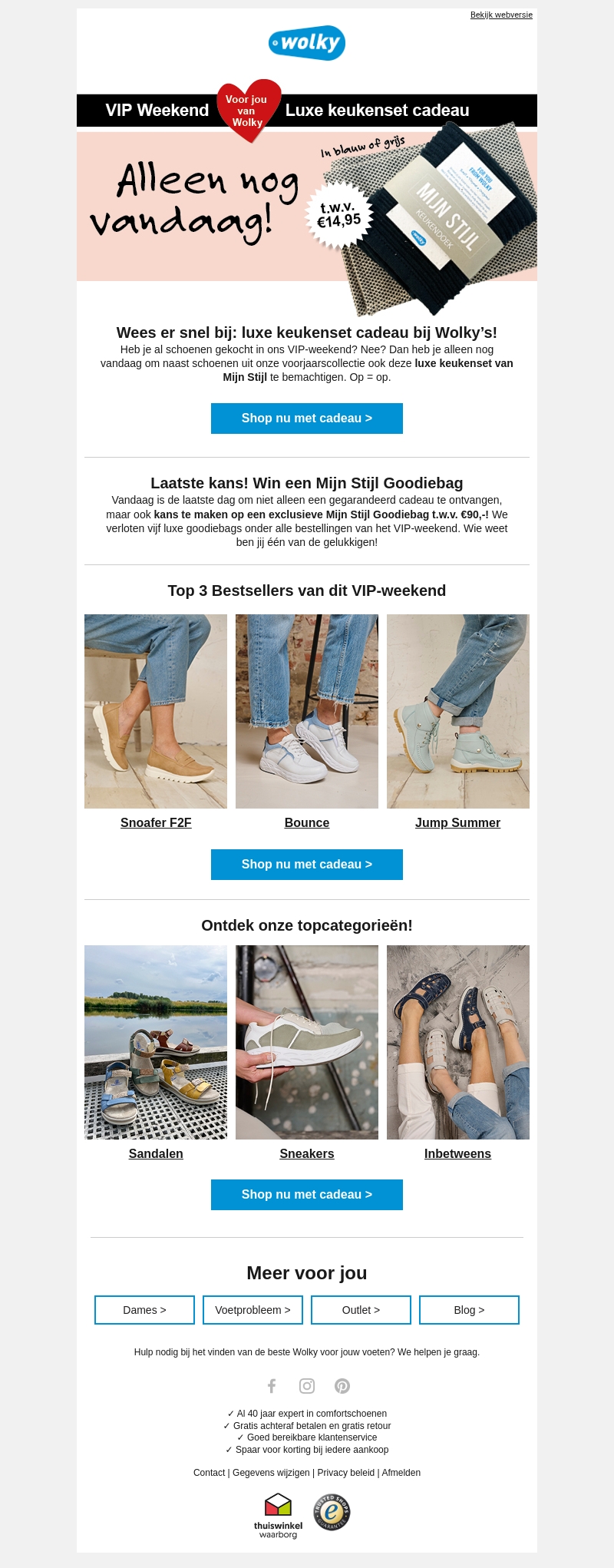 Vandaag is de laatste kans om te profiteren van het VIP Weekend bij Wolky. Bij aankoop van schoenen krijg je een luxe keukenset cadeau. Daarnaast maak je kans op een exclusieve Mijn Stijl Goodiebag. Ontdek de top 3 bestsellers en bekijk onze topcategorieën zoals sandalen en sneakers. Wees er snel bij, want op = op!