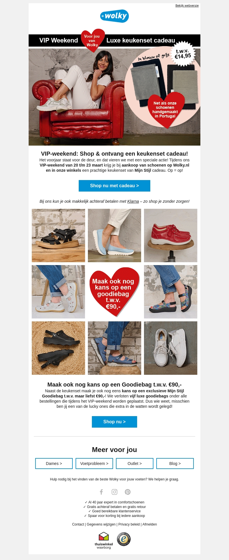 Vier de lente met Wolky's VIP-weekend. Van 20 t/m 23 maart krijg je bij aankoop van schoenen op Wolky.nl een gratis luxe keukenset. Mis ook niet de kans om een Goodiebag t.w.v. β¬90,- te winnen. Shop eenvoudig en veilig met Klarna. Bezoek onze winkels of shop online.