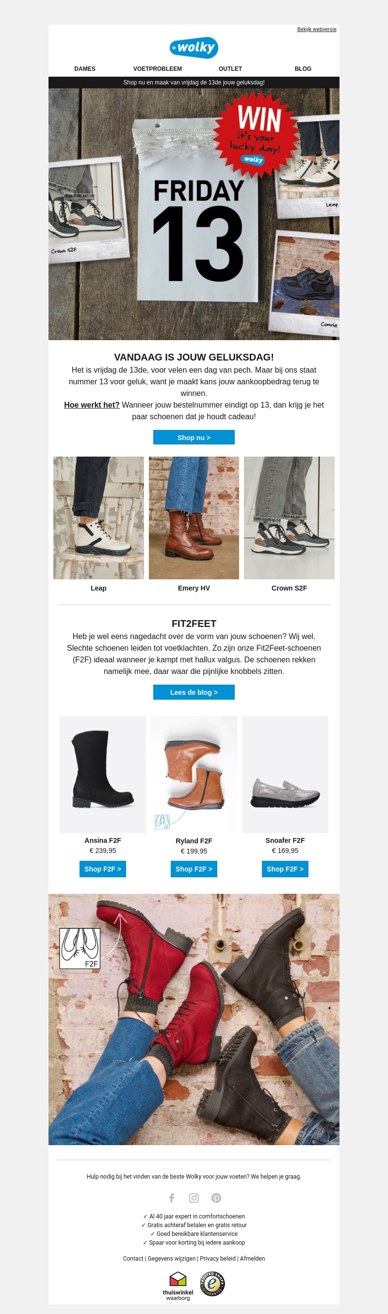 Het is vrijdag de 13e, een dag die voor velen met pech wordt geassocieerd. Maar bij Wolky staat nummer 13 voor geluk! Wanneer jouw bestelnummer eindigt op 13, krijg je kans om je aankoopbedrag terug te winnen. Ontdek onze collectie en maak vandaag nog kans. Lees ook over onze Fit2Feet-schoenen!