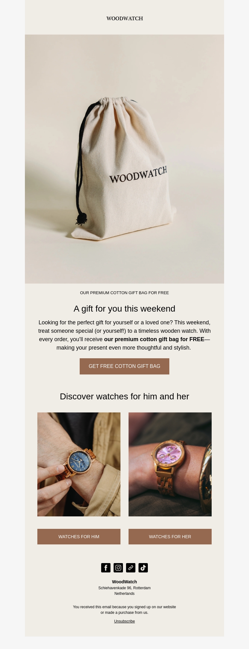 Krijg dit weekend een gratis premium katoenen geschenkzak bij elke bestelling van een tijdloos houten horloge. Verwen jezelf of een geliefde met een stijlvol geschenk. Ontdek onze collectie horloges voor hem en haar en maak je cadeau nog specialer. Deze aanbieding is slechts beperkt beschikbaar, dus mis het niet. Winkel nu en geef een onvergetelijk geschenk.