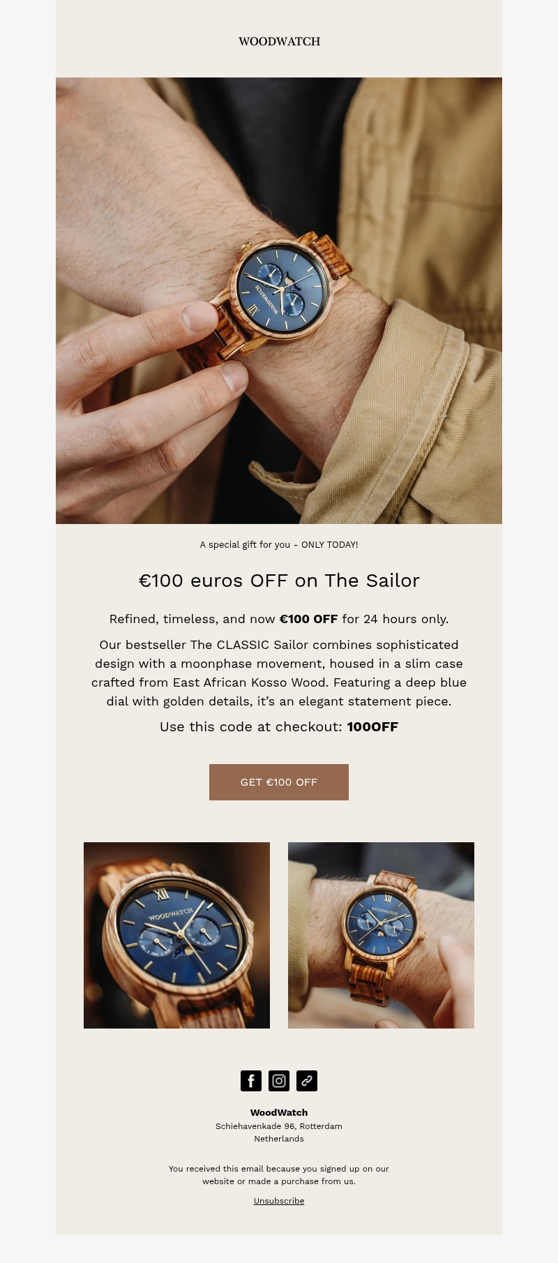 Ontdek de geraffineerde en tijdloze Klassieke Sailor horloge met een exclusieve korting van β¬100. Dit meesterwerk, vervaardigd uit Oost-Afrikaanse Kosso hout, combineert een maanstand uurwerk met gouden details tot een elegant statement. Haast je, want deze aanbieding geldt slechts 24 uur lang.