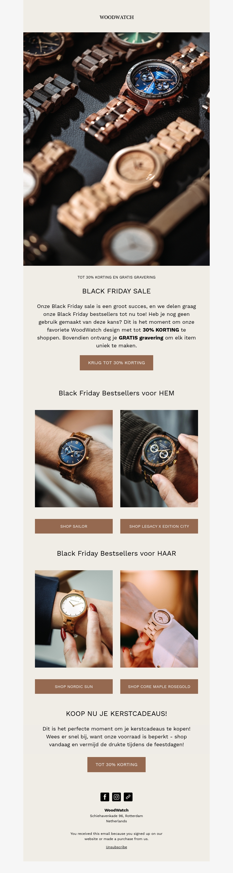 De Black Friday sale van WoodWatch is een groot succes! Profiteer van 30% korting op onze bestsellers voor hem en haar. Elk horloge komt met gratis gravering, zodat je jouw aankoop kunt personaliseren. Mis deze kans niet om unieke WoodWatch horloges te shoppen. Ontdek nu onze selectie en verras jezelf of een geliefde. Wees er snel bij, want de voorraad is beperkt!