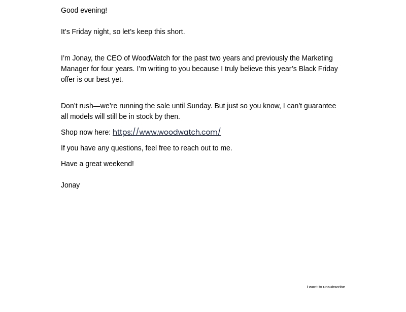 WoodWatch brengt je de beste Black Friday deals. De CEO van het bedrijf, Jonay, nodigt je uit om de nieuwste aanbiedingen te bekijken voor zondag. Mis deze kans niet om unieke horloges te bemachtigen tegen onweerstaanbare prijzen. De voorraad is beperkt, dus wees er snel bij. Bezoek de site en ontdek jouw volgende favoriete horloge. Voor vragen kun je altijd contact opnemen.
