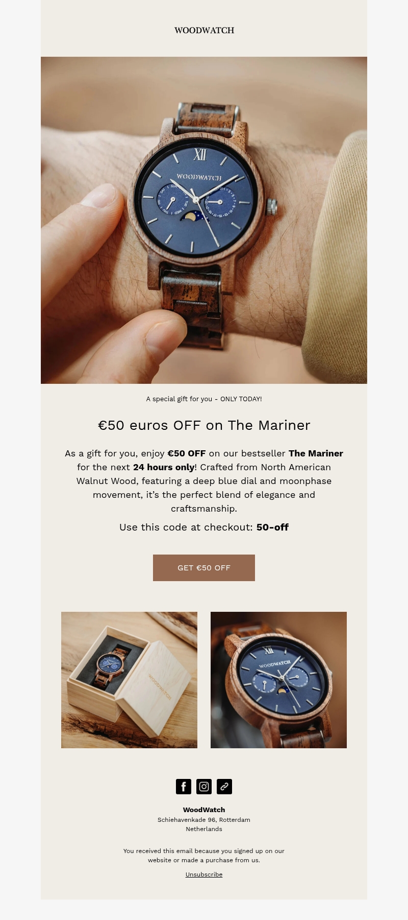 Geniet van een speciale korting van β¬50 op de populaire WoodWatch, The Mariner. Gemaakt van Noord-Amerikaans walnotenhout, is deze horloge een toonbeeld van elegantie en vakmanschap. De actie geldt slechts 24 uur, dus mis deze kans niet! De betoverende blauwe wijzerplaat en maanfasebeweging maken het een must-have voor elke liefhebber. Gebruik de unieke kortingscode bij het afrekenen.