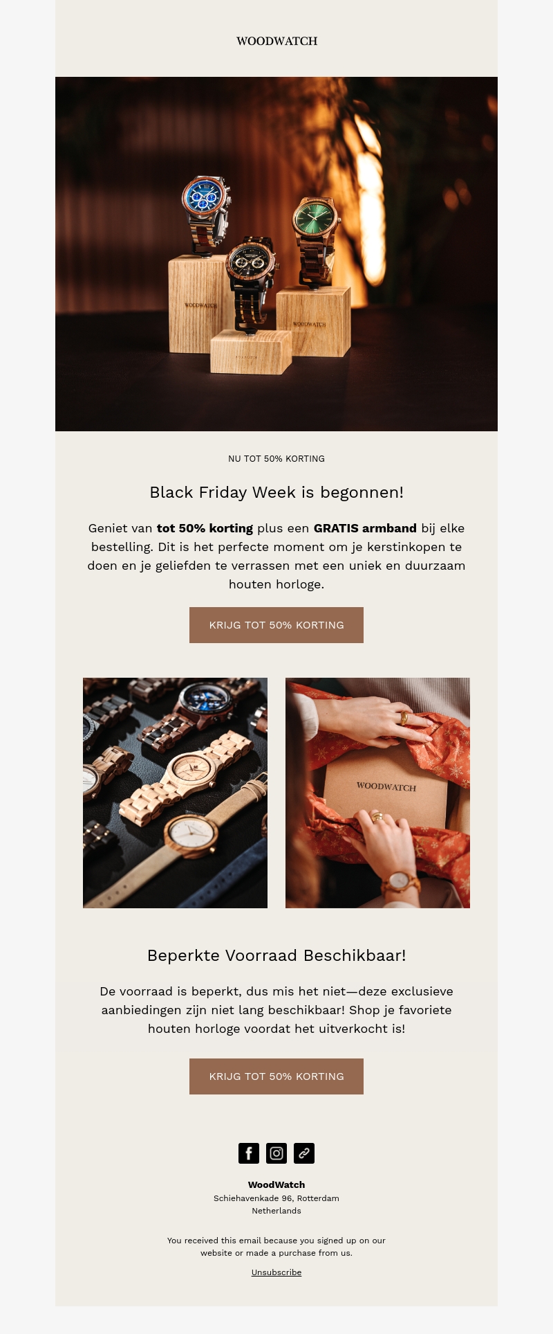 Vier Black Friday met WoodWatch en ontvang tot 50% korting op je aankoop. Als extra verrassing krijg je een gratis armband bij elke bestelling. Deze actie is perfect om je kerstinkopen te doen en je familie en vrienden te verrassen met unieke houten horloges. Let op, de voorraad is beperkt! Shop snel je favoriete horloge voordat het uitverkocht is.