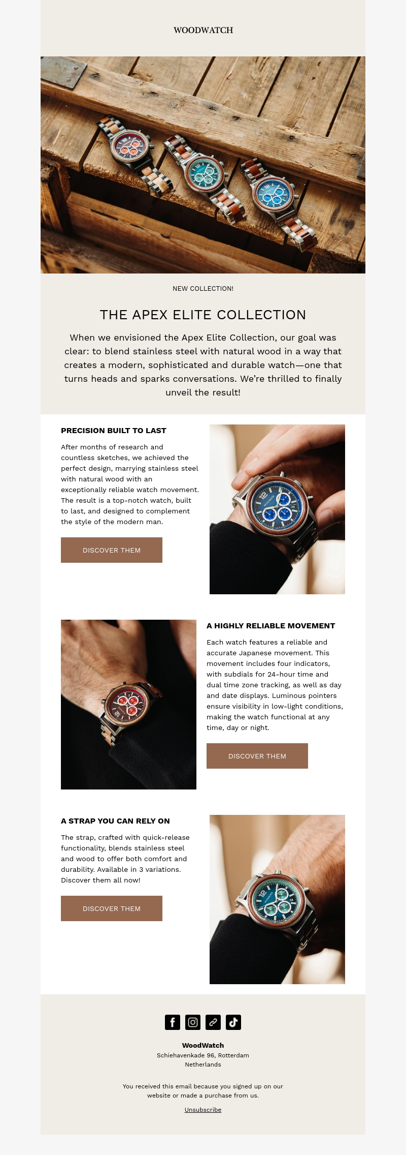 Bij WoodWatch presenteren we met trots de Apex Elite Collectie. Deze horloges combineren roestvrij staal met natuurlijk hout voor een moderne en duurzame stijl. Elk horloge is ontworpen om de aandacht te trekken en interessante gesprekken te starten. Verkrijgbaar in drie varianten – ontdek welke het beste bij jou past!