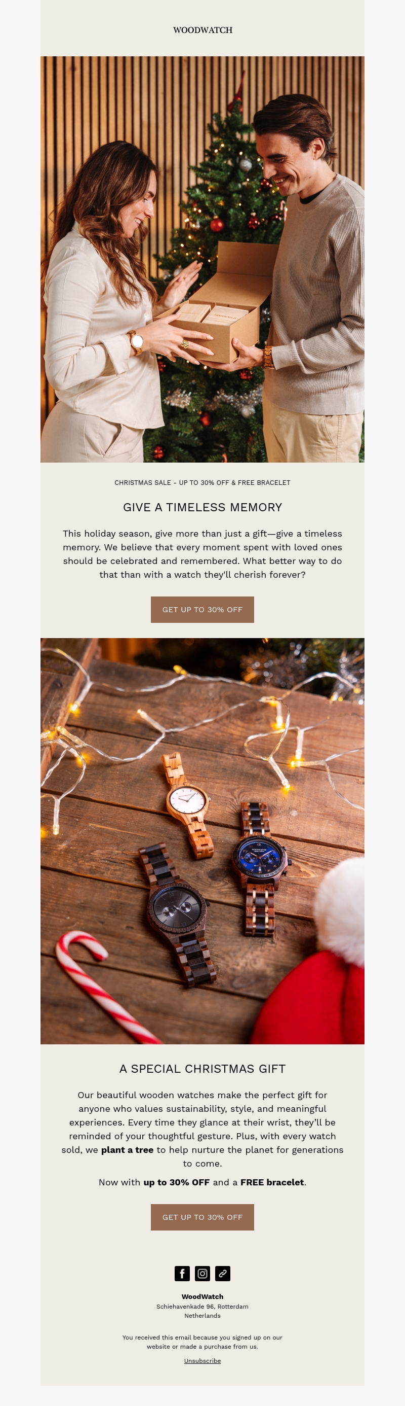 Deze feestdagen draait het om het geven van tijdloze herinneringen. Met een houten horloge van WoodWatch geef je meer dan een cadeau; je geeft een symbool van verbondenheid en duurzaamheid. Geniet van tot wel 30% korting en ontvang een gratis armband. Iedere aankoop helpt ook met het planten van een boom, waardoor je een positieve impact hebt op de planeet.