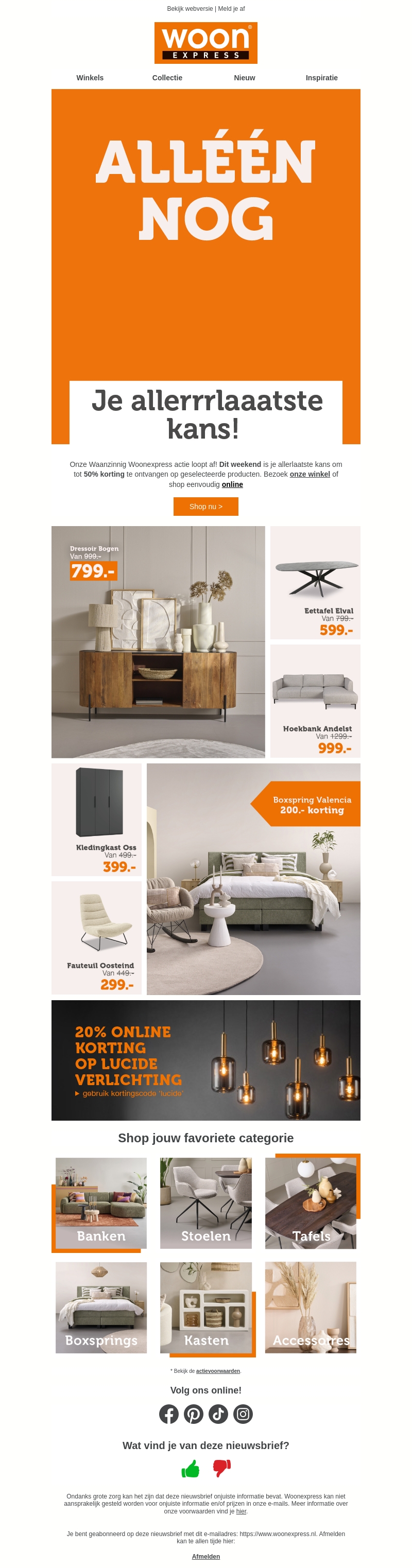 Grijp je allerlaatste kans om tot 50% te besparen op geselecteerde producten bij Woonexpress. Deze week kun je genieten van fantastische kortingen op een breed scala aan meubels en accessoires. Bezoek onze winkels of shop eenvoudig online om je favorieten te scoren. Vergeet niet de kortingscode 'lucide' te gebruiken voor 20% korting op Lucide verlichting. Wees er snel bij, want op=op!