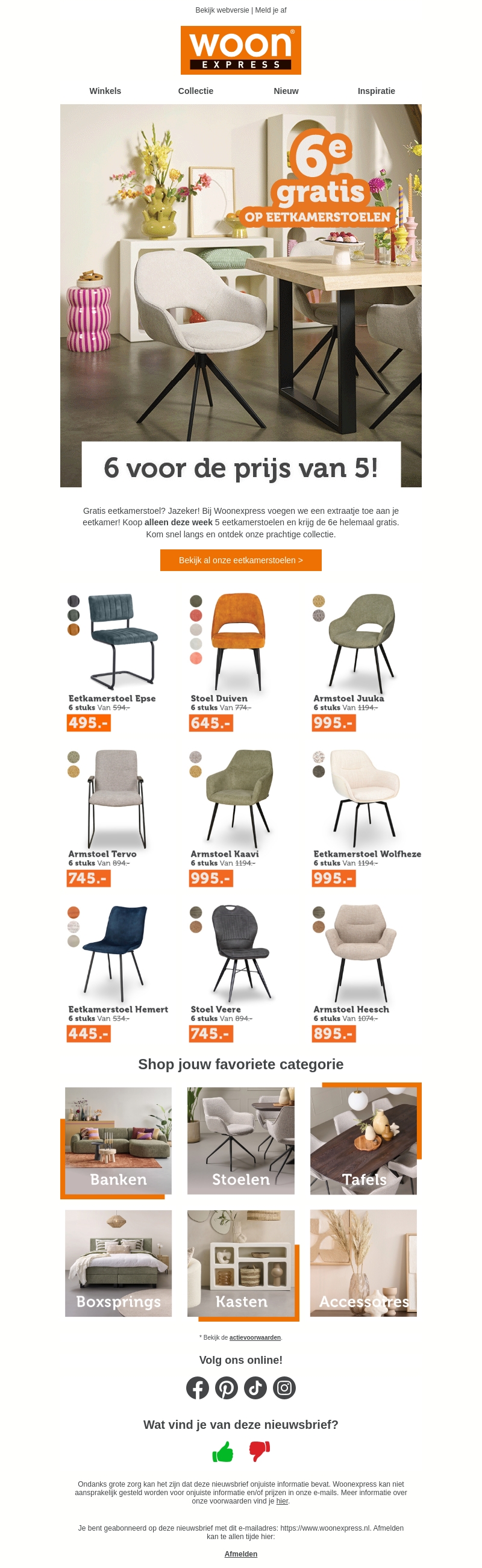 Deze week biedt Woonexpress een speciale actie: koop vijf eetkamerstoelen en ontvang de zesde gratis. Verfris je eetkamer met stijlvolle stoelen uit ons gevarieerde assortiment. Bezoek onze winkel om deze geweldige deal mee te pakken. Bekijk onze prachtige collectie eetkamerstoelen die perfect passen bij elk interieur. Doe mee met deze beperkte tijd aanbieding en verbeter je eetkamer look.
