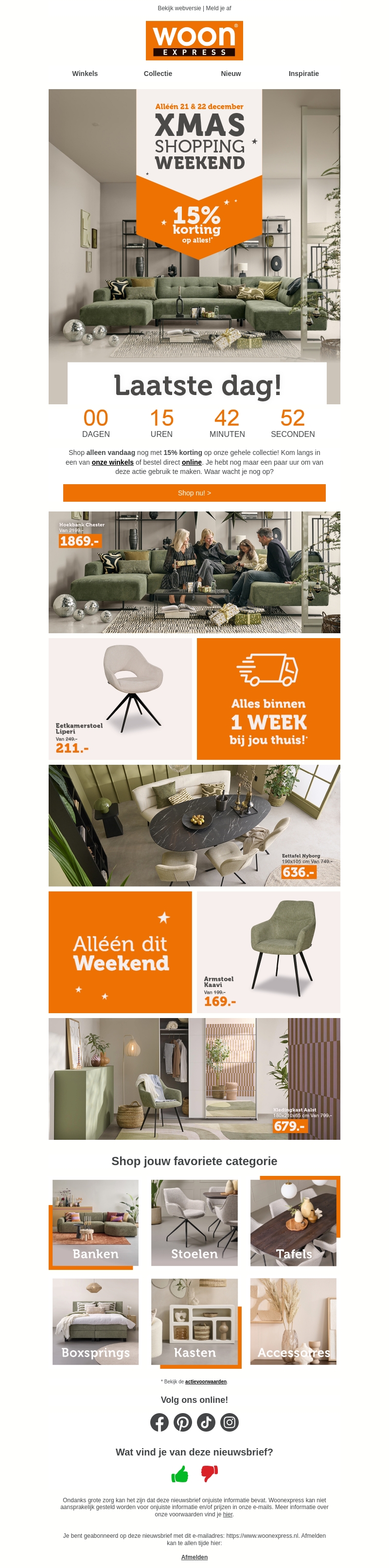Mis het niet: vandaag krijg je 15% korting op alles bij Woonexpress. Bezoek een van onze winkels of bestel online. De actie loopt tot vanavond, dus wacht niet te lang. Bekijk onze stijlvolle banken, stoelen en meer. Alles binnen een week geleverd.