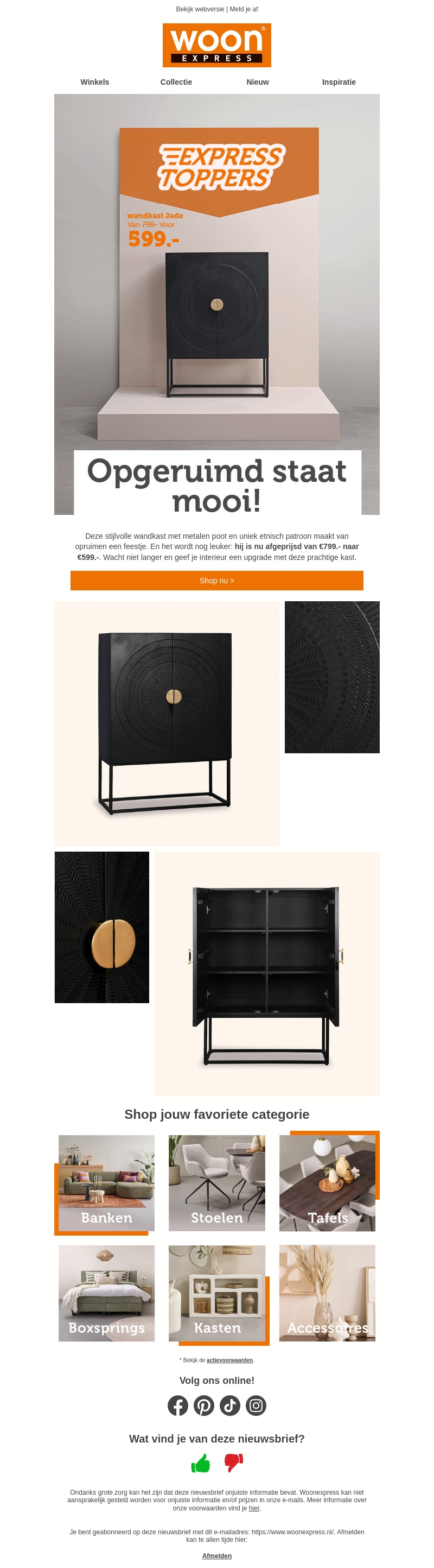 Deze nieuwsbrief presenteert de stijlvolle wandkast Jade, nu in de aanbieding voor slechts β¬599,-. Perfect om jouw interieur een upgrade te geven met zijn unieke etnische patroon en metalen poot. Mis deze kans niet!