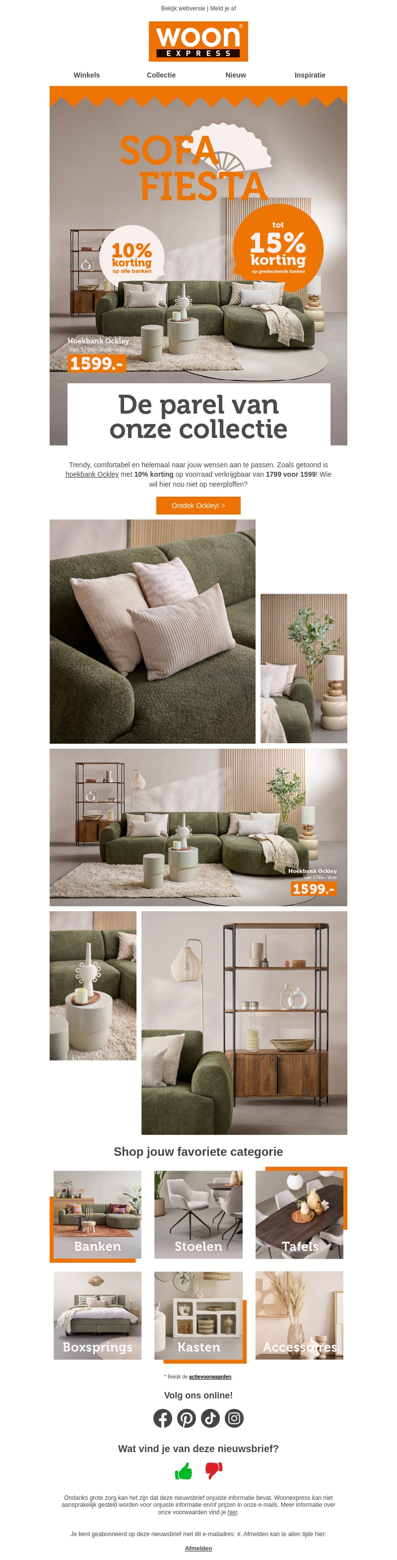 Ontdek de veelzijdige hoekbank Ockley van Woonexpress. Geniet van 10% korting op deze populaire bank, perfect voor jouw stijlvolle interieur. Verkrijgbaar voor slechts 1599,-. Mis deze kans niet om jouw woonruimte te verfraaien met een comfortabele en trendy bank. Ontdek Ockley nu en profiteer van onze geweldige aanbiedingen. Maak van jouw huis een thuis met Woonexpress.