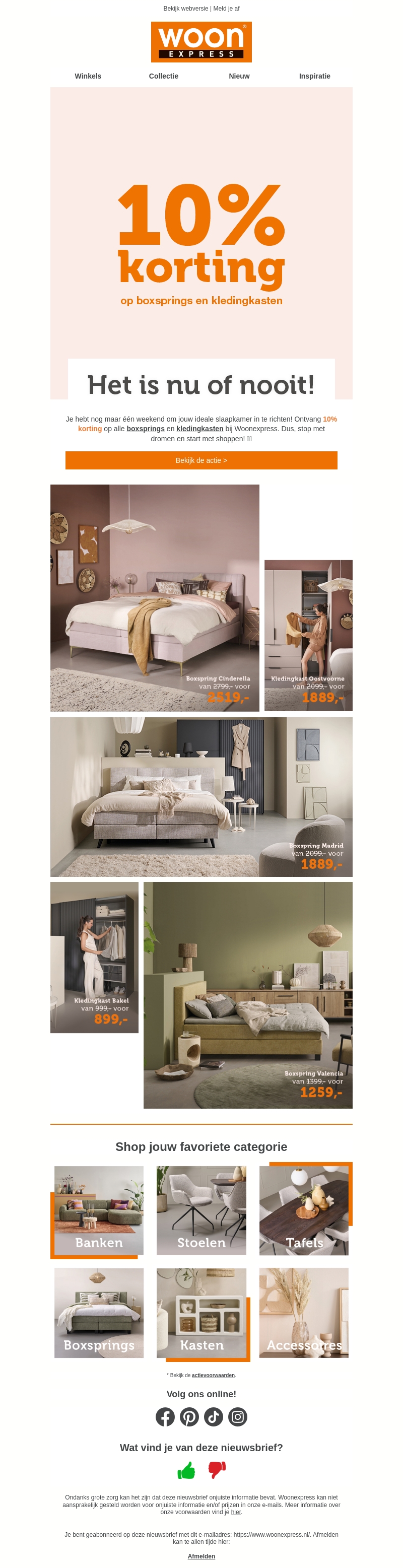 Profiteer nu van 10% korting op alle boxsprings en kledingkasten bij Woonexpress. De actie is beperkt en duurt slechts één weekend. Stop met dromen en begin met shoppen!