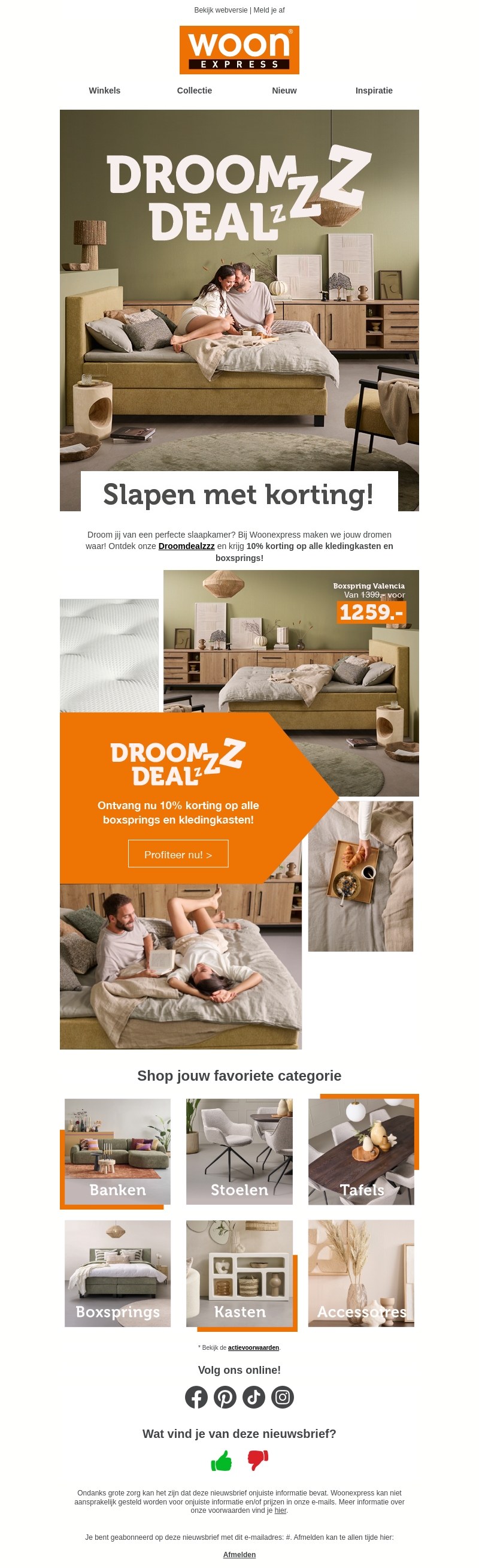 Ben je toe aan een slaapkamer upgrade? Woonexpress helpt je je droomkamer te realiseren met hun nieuwste aanbiedingen. Profiteer van de Droomdealzzz en krijg 10% korting op alle boxsprings en kledingkasten. Of je nu op zoek bent naar een nieuwe, comfortabele boxspring of meer opbergruimte wilt in je slaapkamer, deze deals maken het mogelijk. Mis deze kans niet om je slaapkamer opnieuw in te richten tegen gereduceerde prijzen.