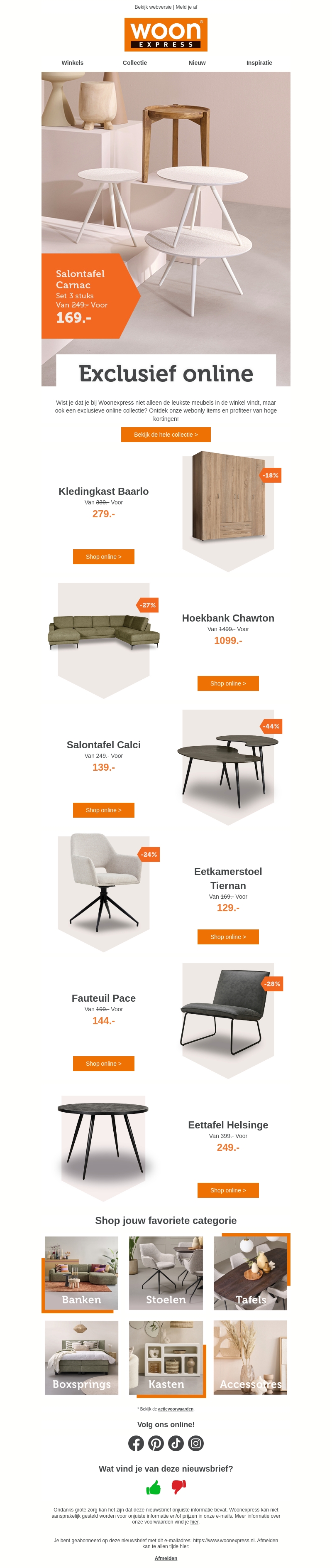 Wist je dat Woonexpress een exclusieve webonly collectie heeft? Ontdek prachtige meubels zoals salontafels, kledingkasten, hoekbanken, en meer. Houd jouw interieur stijlvol en betaalbaar met deze unieke items die je alleen online kunt vinden. Profiteer nu van hoge kortingen!