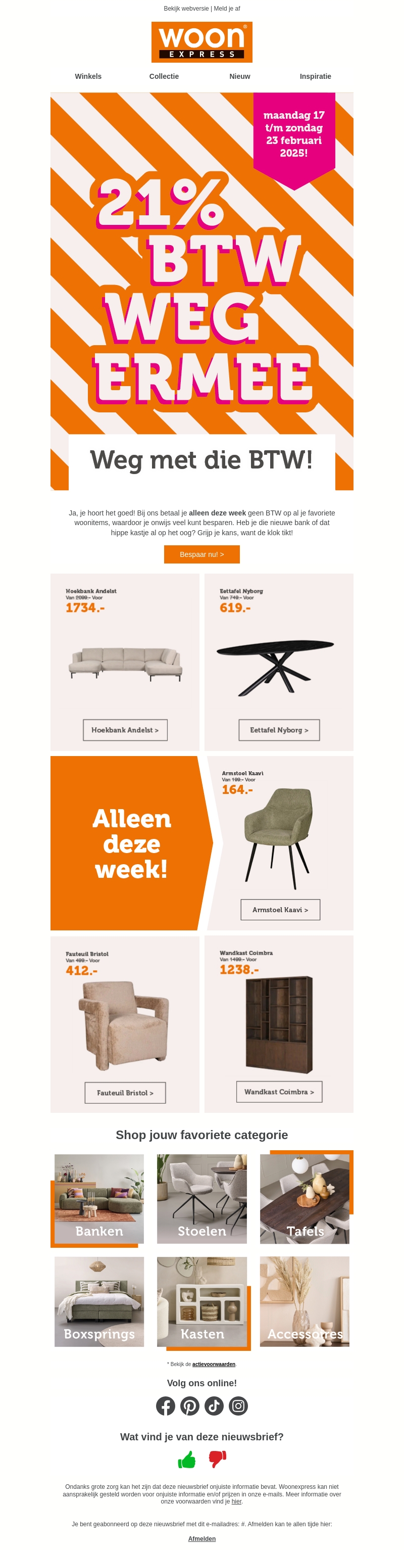 Woonexpress biedt je de kans om deze week 21% BTW te besparen op een groot aantal woonitems. Van banken tot tafels, je vindt alles voor jouw interieur zonder extra kosten. Bezoek ons en ontdek de fantastische aanbiedingen die slechts een week duren. Grijp je kans om die nieuwe bank of kast te kopen. Tik tak, de tijd dringt!
